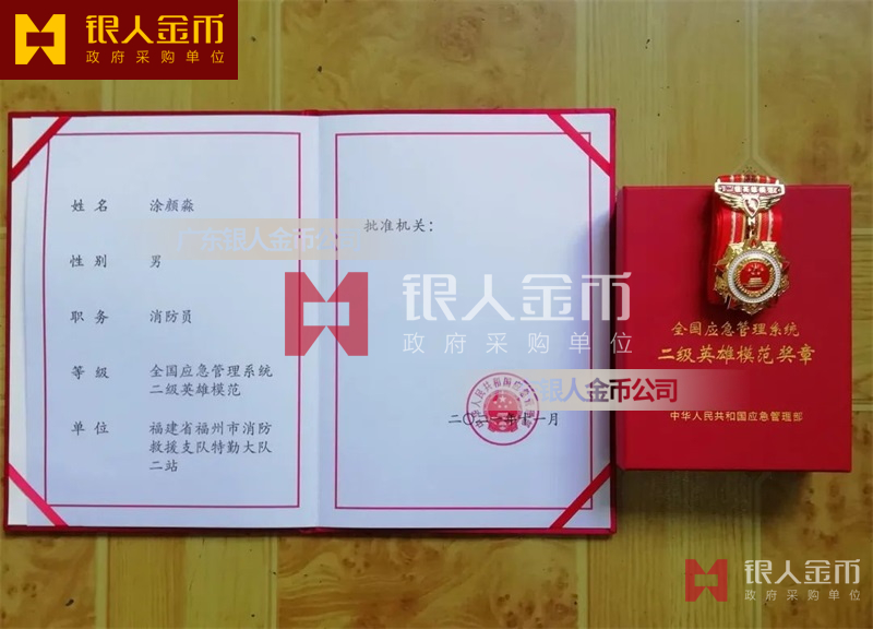 中華人民共和國應(yīng)急管理部全國應(yīng)急管理系統(tǒng)一二三級英雄模范獎?wù)聞渍录o念章獎牌證書(圖)