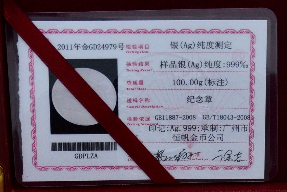 廣東省質(zhì)監(jiān)純銀999銀質(zhì)紀念幣檢驗證書