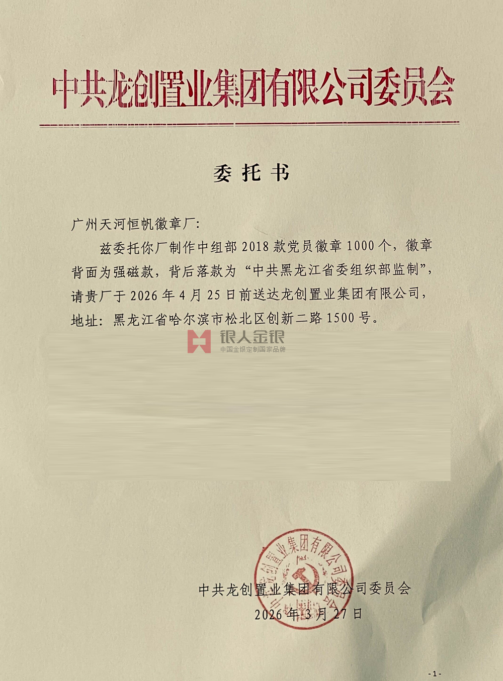 黑龍江省國(guó)企中共龍創(chuàng)置業(yè)集團(tuán)黨委購(gòu)買黨徽公函