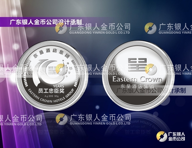 東呈酒店集團(tuán)年會獎勵十年老員工純銀紀(jì)念章制作、千足金紀(jì)念金幣定制