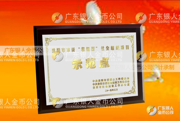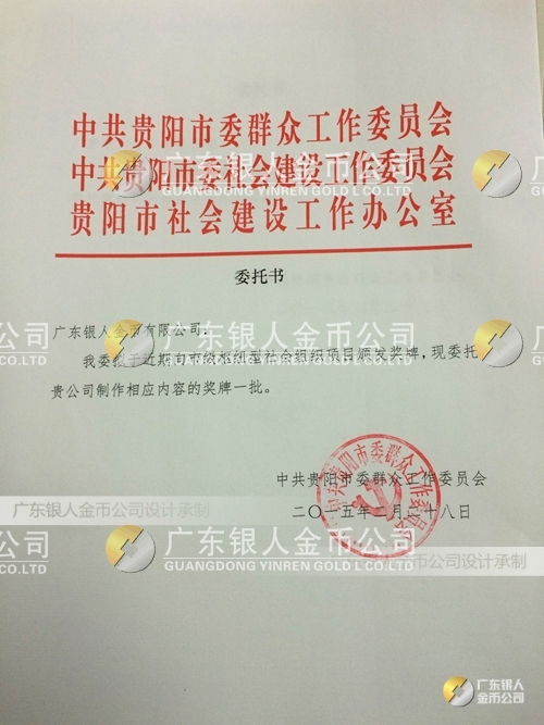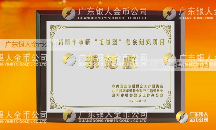 廣東銀人金幣公司設(shè)計制作承接中共貴陽市委、民政局、財政局、群工委、中共貴陽市委社會建設(shè)工作委員會、貴陽市社會建設(shè)工作辦公室表彰樞紐型社會組織項目榮譽獎狀、先進(jìn)集體獎牌、先進(jìn)單位獎牌、先進(jìn)個人牌匾、高檔鈦金獎牌定制。