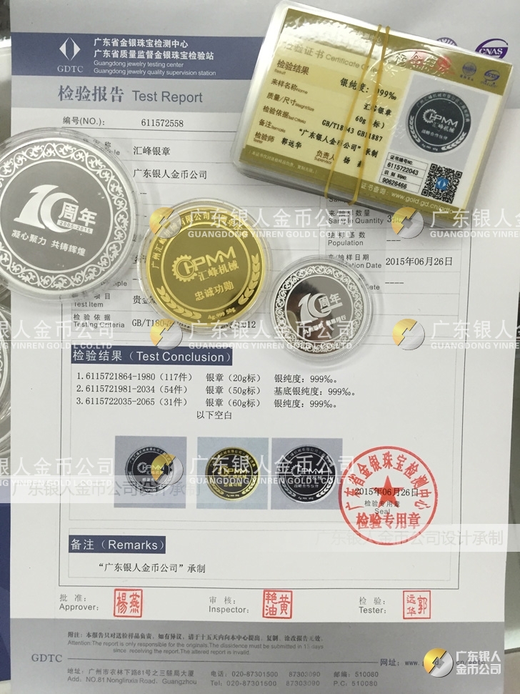 廣東銀人金幣公司承接客戶個性化定制的金銀幣、金銀章、金銀條、金銀牌、金銀盤均由國家質(zhì)監(jiān)部門、嚴格檢測、權(quán)威鑒定: