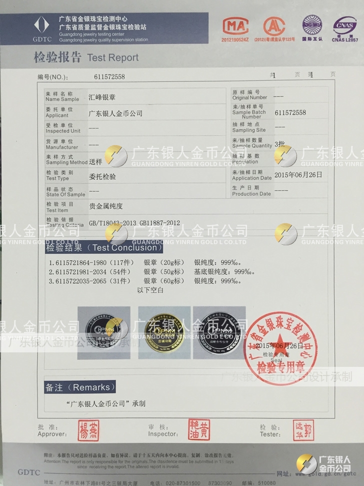 廣東銀人金幣公司承接客戶個(gè)性化定制的金銀幣、金銀章、金銀條、金銀牌、金銀盤均由國(guó)家質(zhì)監(jiān)部門、嚴(yán)格檢測(cè)、權(quán)威鑒定: