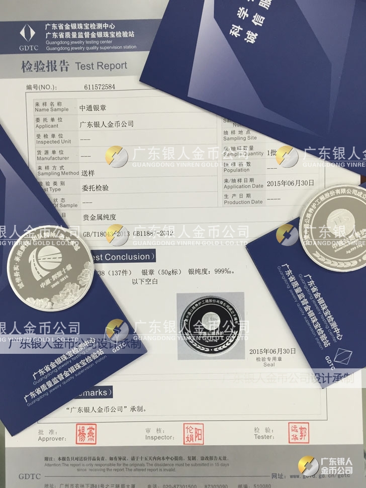 廣東銀人金幣公司承接客戶個性化定制的金銀幣、金銀章、金銀條、金銀牌、金銀盤均由國家質(zhì)監(jiān)部門、嚴(yán)格檢測、權(quán)威鑒定: