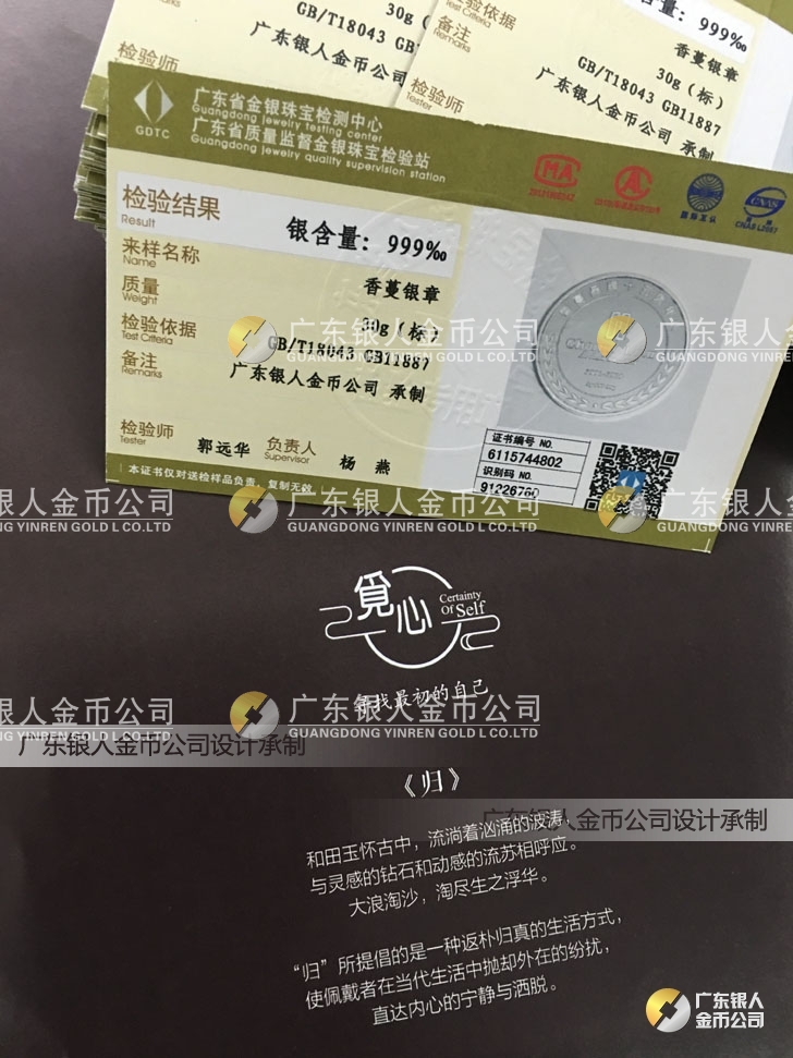 廣東銀人金幣公司承接客戶個性化定制的金銀幣、金銀章、金銀條、金銀牌、金銀盤均由國家質(zhì)監(jiān)部門、嚴(yán)格檢測、權(quán)威鑒定:
