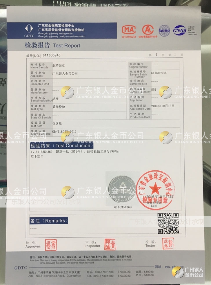 廣東銀人金幣公司承接客戶個性化定制的金銀幣、金銀章、金銀條、金銀牌、金銀盤均由國家質(zhì)監(jiān)部門、嚴格檢測、權(quán)威鑒定: